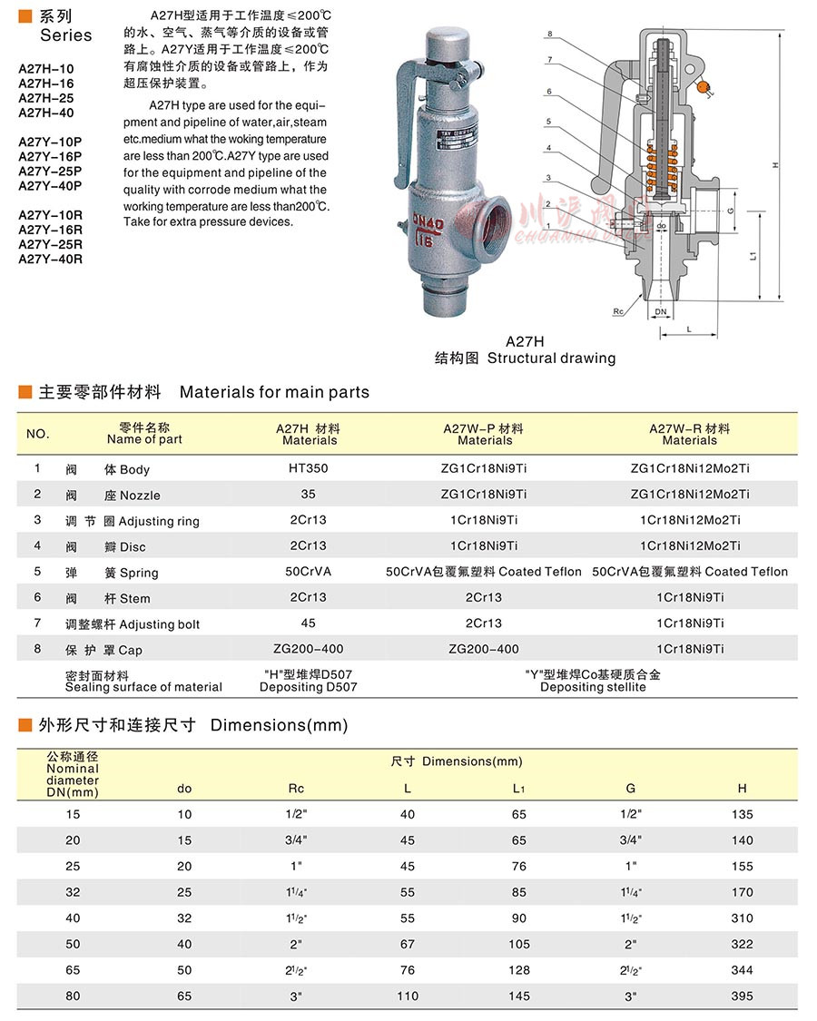 A27H型微啟式安全閥適用于工作溫度≤200℃的水、空氣、蒸氣等介質(zhì)的設(shè)備或管路上。A27Y微啟式安全閥適用于工作溫度≤200℃有腐蝕性介質(zhì)的設(shè)備或管路上,作為超壓保護(hù)裝置。