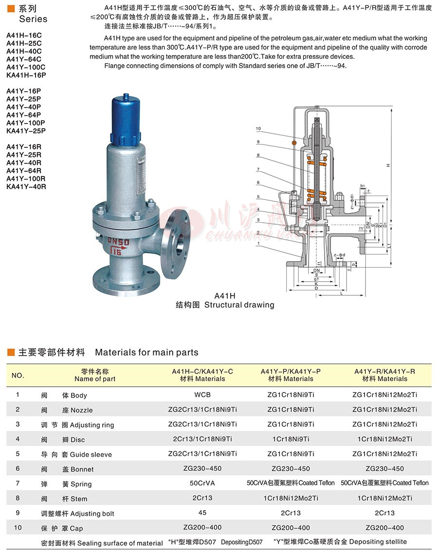 A41H型微啟封閉式安全閥適用于工作溫度≤300℃的石油氣、空氣、水等介質(zhì)的設(shè)備或管路上。A41Y-P/R微啟封閉式安全閥型適用于工作溫度≤200℃有腐蝕性介質(zhì)的設(shè)備或管路上,作為超壓保護裝置。