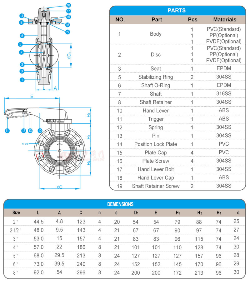 閥體材質(zhì):UPVC(-10℃~+70℃)、CPVC(-40℃~+95℃)、RPP(-14℃-+100℃)、PVDF(-40℃-+140℃)