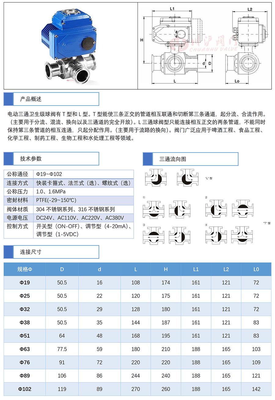 電動驅動器選擇有 開關型電動三通衛(wèi)生級球閥、調節(jié)型電動三通衛(wèi)生級球閥、防爆型開關型電動三通衛(wèi)生級球閥、防爆型調節(jié)型電動三通衛(wèi)生級球閥、智能型電動三通衛(wèi)生級球閥。
