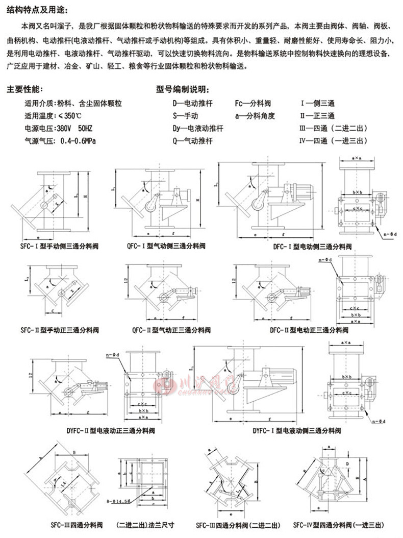 SFC正、側(cè)三通溜子又名叫溜子,是我廠根據(jù)固體顆粒和粉狀物料輸送的特殊要求而開發(fā)的系列產(chǎn)品,本閥主要由閥體、閥軸、閥板、曲柄機構(gòu)、電動推桿(電液動推桿、氣動推桿或手動機構(gòu))等組成。具有體積小、重量輕、耐磨性能好、使用壽命長、阻力小,是利用電動推桿、電液動推桿、氣動推桿驅(qū)動,可以快速切換物料流向。是物料輸送系統(tǒng)中控制物料快速換向的理想設(shè)備,廣泛應(yīng)用于建材、冶金、礦山、輕工、糧食等行業(yè)固體顆粒和粉狀物料輸送。