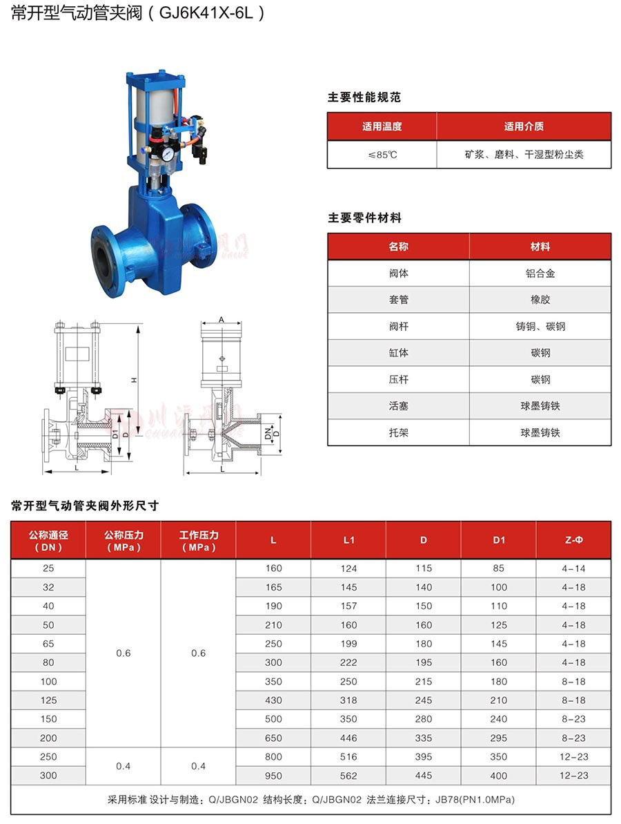 氣動(dòng)管夾閥由上下鑄鐵、鑄鋼閥體、橡膠管套、大小閥桿、閘板、上下導(dǎo)柱、氣動(dòng)裝置等零件組成,也可根據(jù)需要選擇驅(qū)動(dòng)裝置。氣動(dòng)管夾閥廣泛應(yīng)用于化工工業(yè)、石油工業(yè)、電力部門、冶金工業(yè)、污水處理等方面。