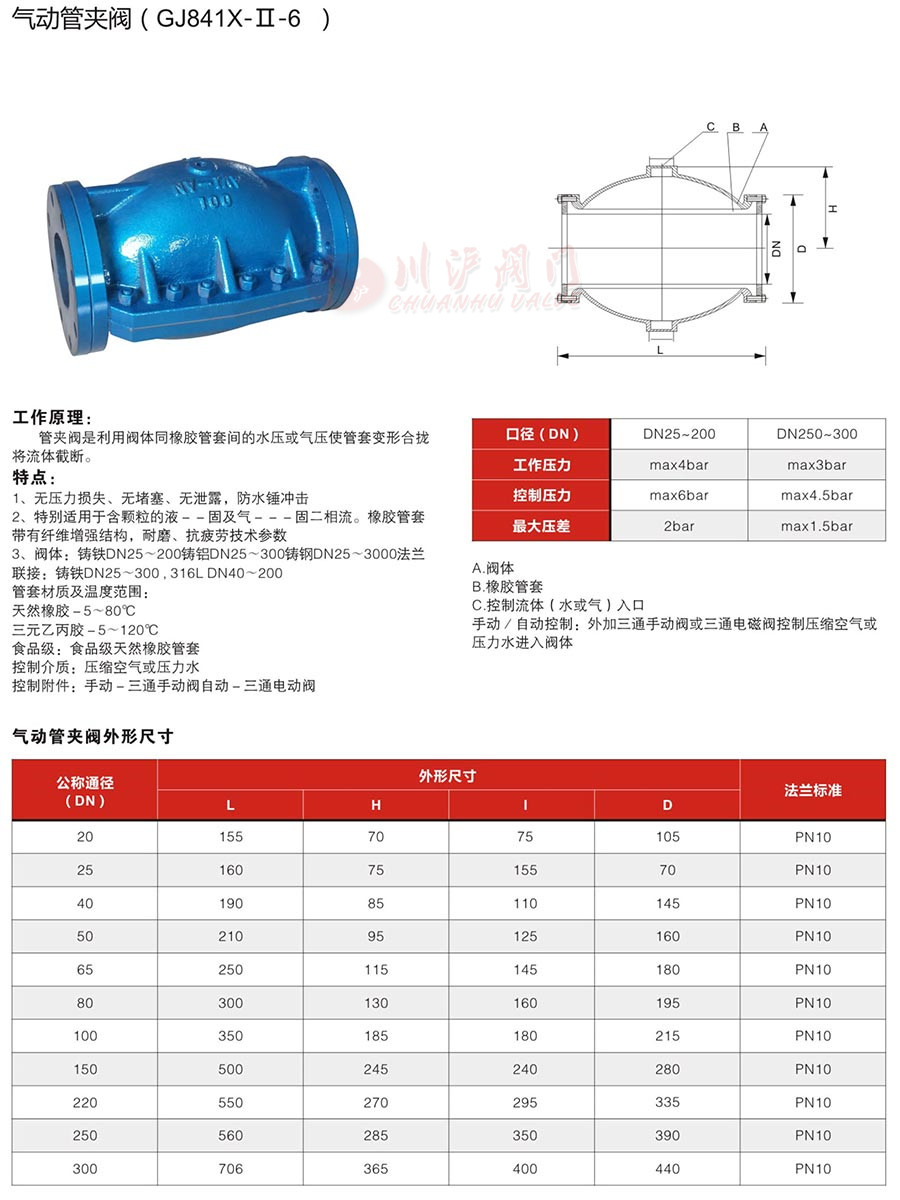 鑄鐵氣動管夾閥是利用閥體同橡膠管套間的水壓或氣壓使管套變形合攏將流體截斷。