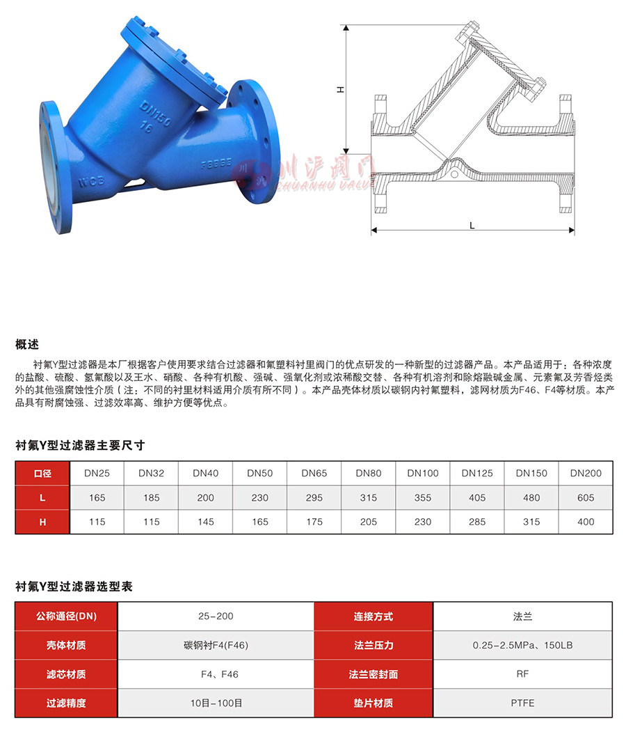 GL41F46襯氟Y型過濾器是上海川滬根據(jù)客戶使用要求結(jié)合過濾器和氟塑料襯里閥門的優(yōu)點(diǎn)研發(fā)的一種新型的過濾器產(chǎn)品。本產(chǎn)品適用于:各種濃度的鹽酸、硫酸、氫氟酸以及王水、硝酸、各種有機(jī)酸、強(qiáng)堿、強(qiáng)氧化劑或濃稀酸交替、各種有機(jī)溶劑和除熔融堿金屬、元素氟及芳香烴類外的其他強(qiáng)腐蝕性介質(zhì)(注:不同的襯里材料適用介質(zhì)有所不同)。本產(chǎn)品殼體材質(zhì)以碳鋼內(nèi)襯氟塑料,濾網(wǎng)材質(zhì)為F46、F4等材質(zhì)。本產(chǎn)品具有耐腐蝕強(qiáng)、過濾效率高、維護(hù)方便等優(yōu)點(diǎn)。