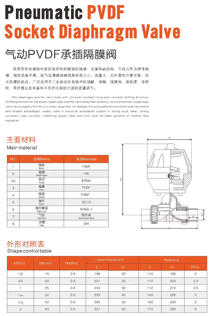 氣動PVDF雙由令隔膜閥采用耐腐蝕的閥體和耐腐蝕的隔膜、無填料函結(jié)構(gòu)、節(jié)流元件為彈性隔膜、閥體流道平滑,故氣動薄膜隔膜調(diào)具有陰力小,流量大、無外漏和方便可靠、防火防爆的優(yōu)點(diǎn),廣泛適用于工業(yè)自動化系統(tǒng)中的強(qiáng)酸、強(qiáng)堿、強(qiáng)腐蝕、高粘度、含顆粒、帶纖維以及有番和不充許污染的介質(zhì)的流量調(diào)節(jié)。