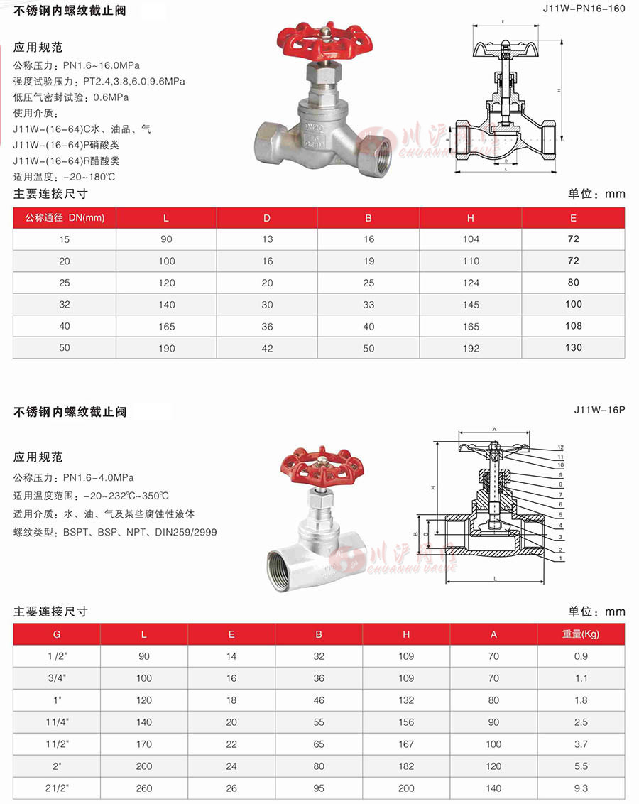 J11W內(nèi)螺紋截止閥產(chǎn)品參數(shù): 公稱壓力:PN1.6~16.0MPa