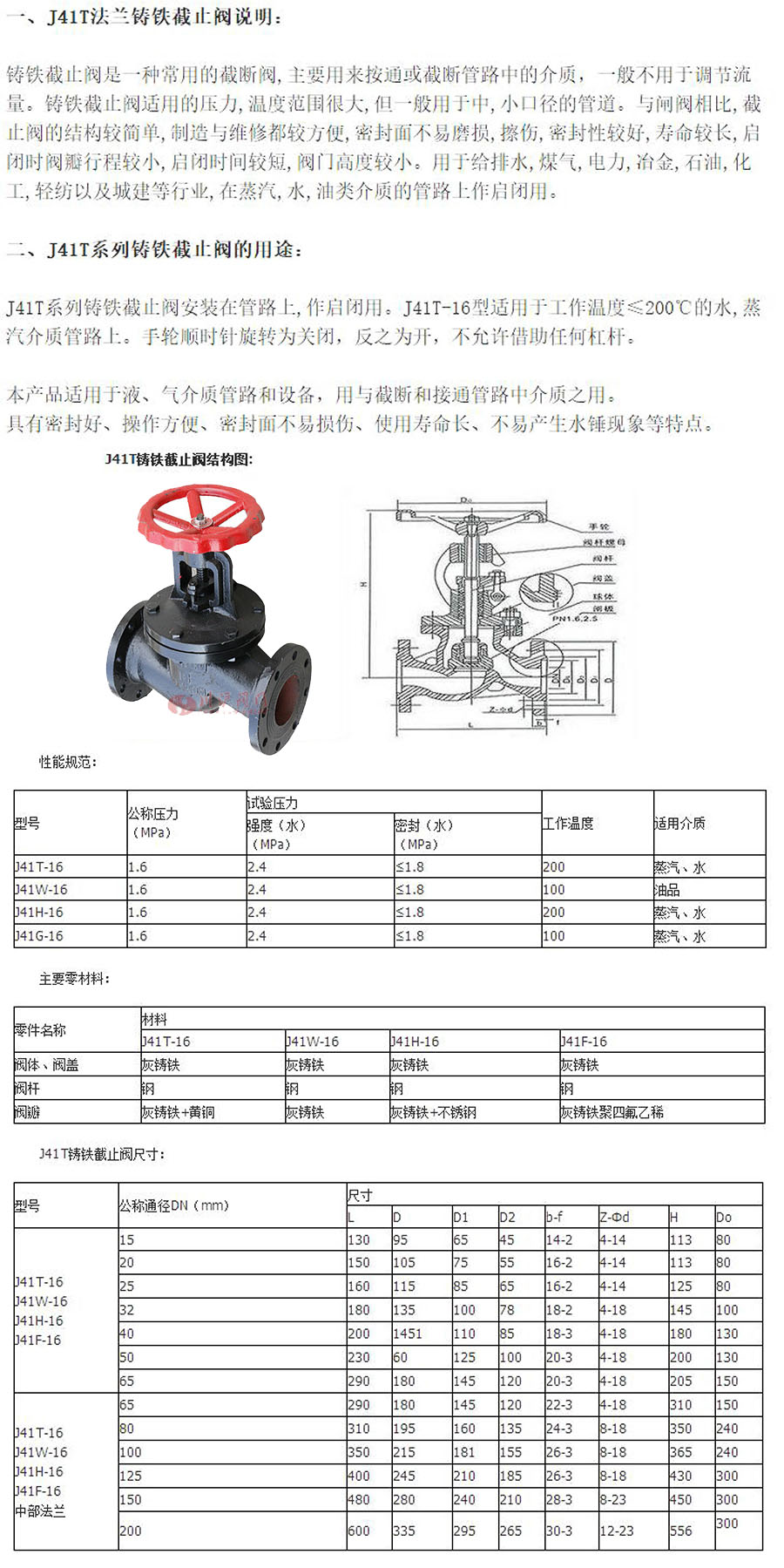 J41T系列鑄鐵截止閥安裝在管路上,作啟閉用。J41T-16型適用于工作溫度≤200℃的水,蒸汽介質(zhì)管路上。手輪順時針旋轉(zhuǎn)為關(guān)閉,反之為開,不允許借助任何杠桿。本產(chǎn)品適用于液、氣介質(zhì)管路和設(shè)備,用與截斷和接通管路中介質(zhì)之用。