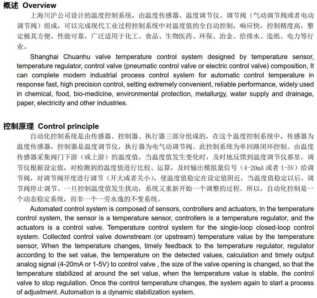200E電控溫度控制系統(tǒng)包含電動調(diào)節(jié)閥、控制箱和溫度傳感器??梢酝瓿涩F(xiàn)代工業(yè)過程中對管道溫度的全自動控制。具有安裝方便、響應(yīng)快、控制精度高、整定方便、性能可靠等特點。廣泛適用于化工、食品、生物醫(yī)藥、環(huán)保、冶金、給排水、造紙、電力等行業(yè)。