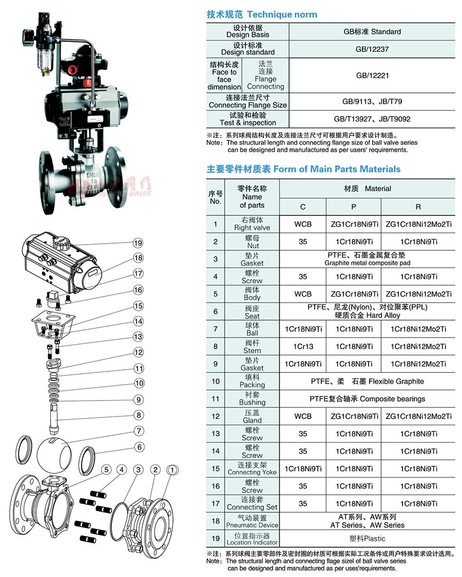 氣動(dòng)法蘭球閥由球閥和氣動(dòng)活塞式執(zhí)行機(jī)構(gòu)組成。DN15~200為浮動(dòng)球式結(jié)構(gòu),DN250~300為固定球式結(jié)構(gòu),閥座采用撓性的唇緣結(jié)構(gòu),具有磨損補(bǔ)償和中腔自動(dòng)泄壓作用,因而密封可靠,壽命長(zhǎng)。執(zhí)行機(jī)構(gòu)采用公司的AT系列活塞氣動(dòng)執(zhí)行機(jī)構(gòu)。該執(zhí)行機(jī)構(gòu)具有體積小、重量輕、輸出力大等特點(diǎn),且活塞與缸體間配有摩擦系數(shù)較低的非金屬導(dǎo)向環(huán),避免了活塞與缸體的直接接觸,降低了摩擦力,因而執(zhí)行機(jī)構(gòu)動(dòng)作靈敏、使用壽命長(zhǎng)。
