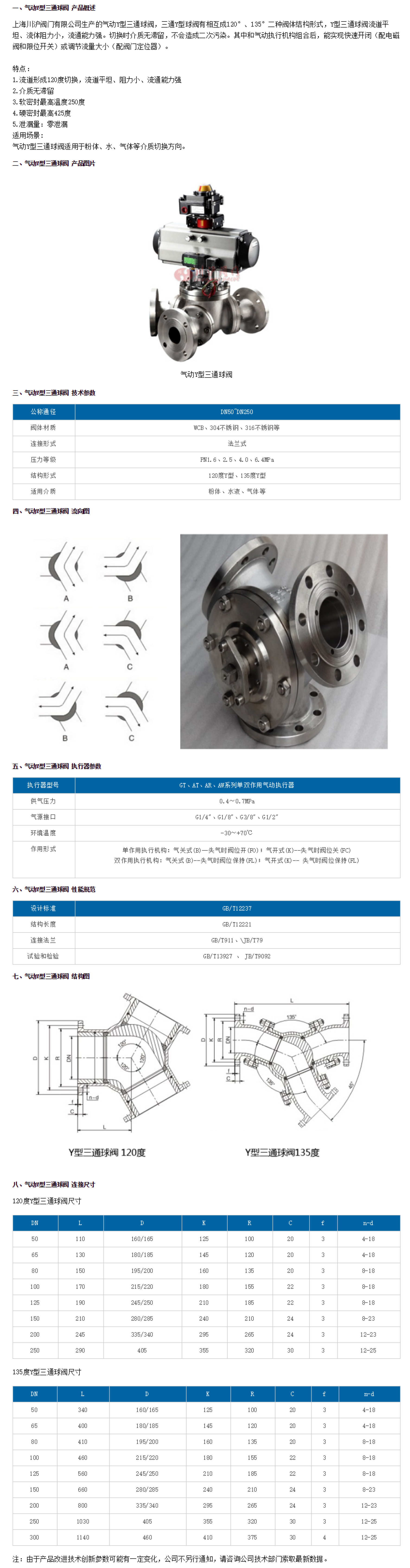 氣動(dòng)Y型三通球閥,三通Y型球閥有相互成120°、135°二種閥體結(jié)構(gòu)形式,Y型三通球閥流道平坦、流體阻力小,流通能力強(qiáng)。切換時(shí)介質(zhì)無滯留,不會(huì)造成二次污染。其中和氣動(dòng)執(zhí)行機(jī)構(gòu)組合后,能實(shí)現(xiàn)快速開閉(配電磁閥和限位開關(guān))或調(diào)節(jié)流量大?。ㄅ溟y門定位器)。