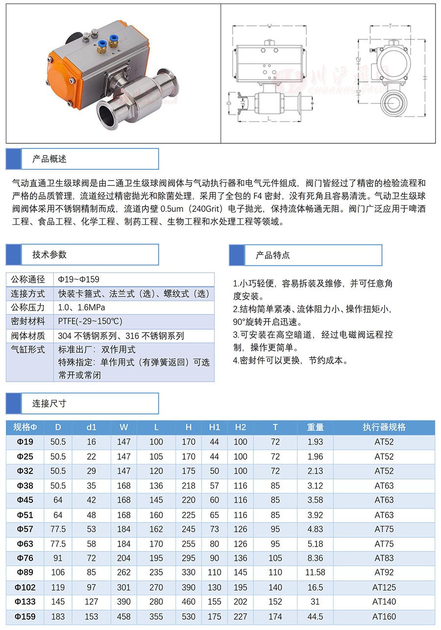 氣動直通衛(wèi)生級球閥是由二通衛(wèi)生級球閥閥體與氣動執(zhí)行器和電氣元件組成,閥門皆經(jīng)過了精密的檢驗流程和嚴格的品質(zhì)管理,流道經(jīng)過精密拋光和除菌處理,采用了全包的F4密封,沒有死角且容易清洗。氣動衛(wèi)生級球閥閥體采用不銹鋼精制而成,流道內(nèi)壁0.5um(240Grit)電子拋光,保持流體暢通無阻。閥門廣泛應用于啤酒工程、食品工程、化學工程、制藥工程、生物工程和水處理工程等領域。