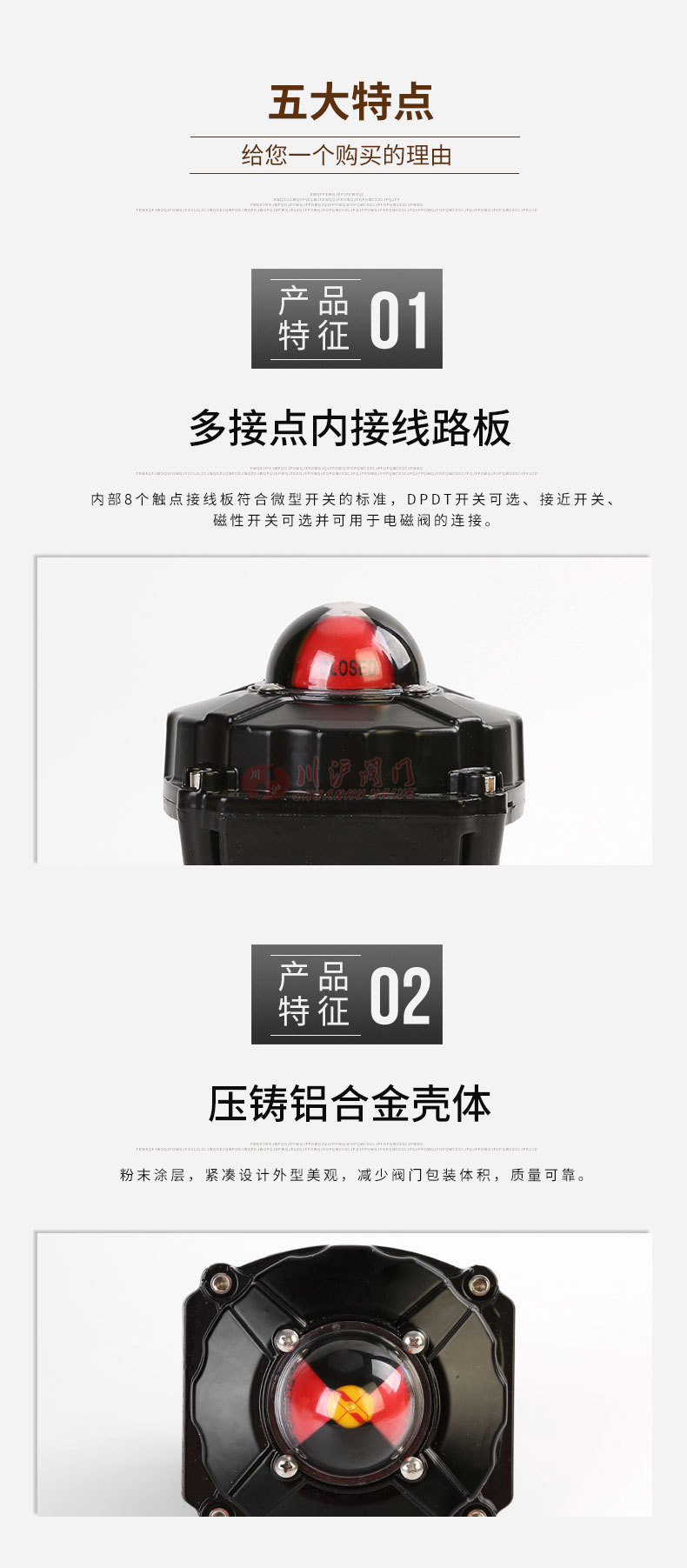防爆型限位開關(guān)是作用于氣缸上的一種反饋附件,內(nèi)部8個觸點接線板符合微型開關(guān)的標(biāo)準(zhǔn),DPDT開關(guān)可選、接近開關(guān)、磁性開關(guān)可選并可用于電磁閥的連接。防爆型限位開關(guān)采用壓鑄鋁合金殼體,粉末涂層,緊湊設(shè)計外型美觀,減少閥門包裝體積,質(zhì)量可靠。
