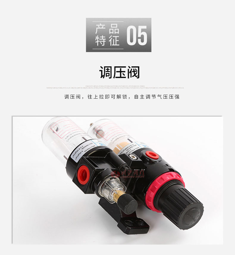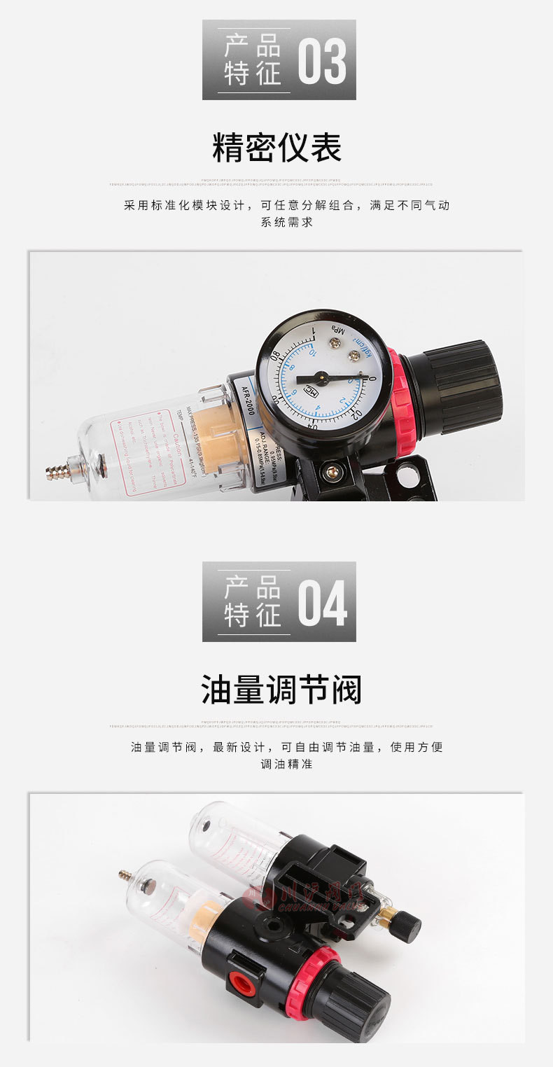 氣源三聯(lián)件高分子材料壓造,高強(qiáng)度耐熱不易老化,密封性能好清晰度高杯體大,不滲透不漏氣。采用標(biāo)準(zhǔn)化模塊設(shè)計(jì),可任意分解組合,滿足不同氣動(dòng)系統(tǒng)需求。