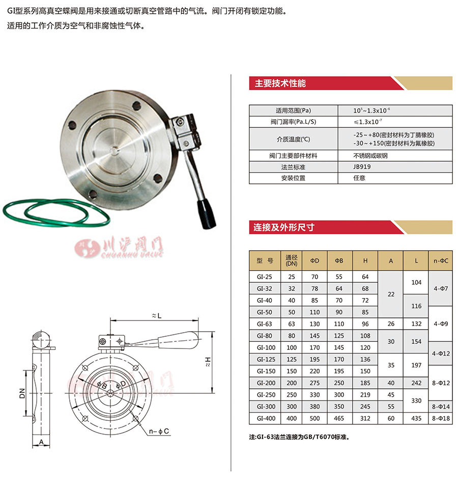 手動(dòng)真空蝶閥GI型系列高真空蝶閥是用來接通或切斷真空管路中的氣流。閥門開閉有鎖定功能。
