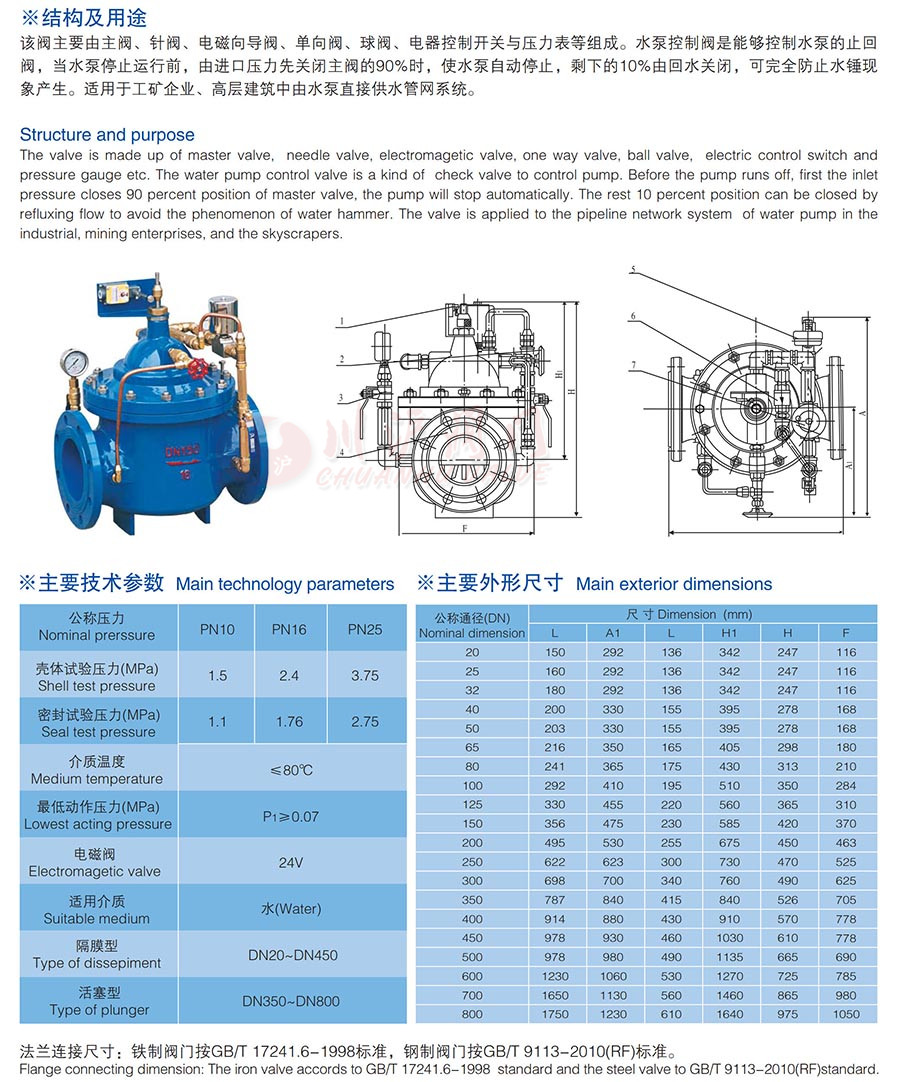 700X水泵控制閥主要由主閥、針閥、電磁向?qū)чy、單向閥、球閥、電器控制開關(guān)與壓力表等組成。水泵控制閥是能夠控制水泵的止回閥,當(dāng)水泵停止運(yùn)行前,由進(jìn)口壓力先關(guān)閉主閥的90%時(shí),使水泵自動(dòng)停止,剩下的10%由回水關(guān)閉,可完全防止水錘現(xiàn)象產(chǎn)生。適用于工礦企業(yè)、高層建筑中由水泵直接供水管網(wǎng)系統(tǒng)。