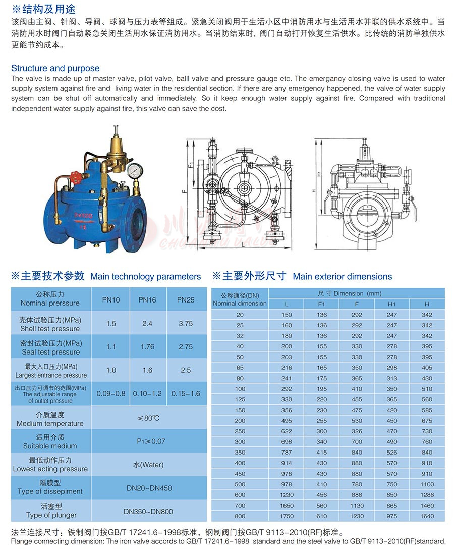 900X緊急關(guān)閉閥由主閥、針閥、導(dǎo)閥、球閥與壓力表等組成。緊急關(guān)閉閥用于生活小區(qū)中消防用水與生活用水并聯(lián)的供水系統(tǒng)中。當(dāng)消防用水時(shí)閥門(mén)自動(dòng)緊急關(guān)閉生活用水保證消防用水。當(dāng)消防結(jié)束時(shí),閥門(mén)自動(dòng)打開(kāi)恢復(fù)生活供水。比傳統(tǒng)的消防單獨(dú)供水更能節(jié)約成本。