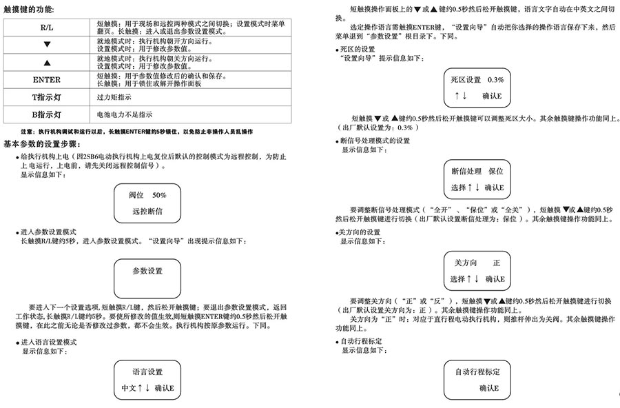 2SB6系列智能型電動執(zhí)行機構(gòu)適用于工業(yè)過程的閉環(huán)控制系統(tǒng),能可靠地對調(diào)節(jié)閥實行精確控制。主要應(yīng)用于電站,冶金,污水處理,石化等領(lǐng)域。該智能型電動執(zhí)行機構(gòu)結(jié)構(gòu)緊湊,重量輕,體積小。它采用直流無刷電機以及齒輪箱減速,具有高效率,噪音低。后還采用電動機里面的霍爾傳感器來檢測位置,具有控制精度高,壽命長,簡化了機械結(jié)構(gòu)。電氣控制部分采用模塊化設(shè)計,由驅(qū)動單元,控制單元,液晶顯示單元,非侵入式的觸摸按鍵單元組成,具有操作簡單,調(diào)試方便,接線方便。轉(zhuǎn)矩控制以及行程限位都通過電子電路來實現(xiàn),從而實現(xiàn)無需開蓋調(diào)試。