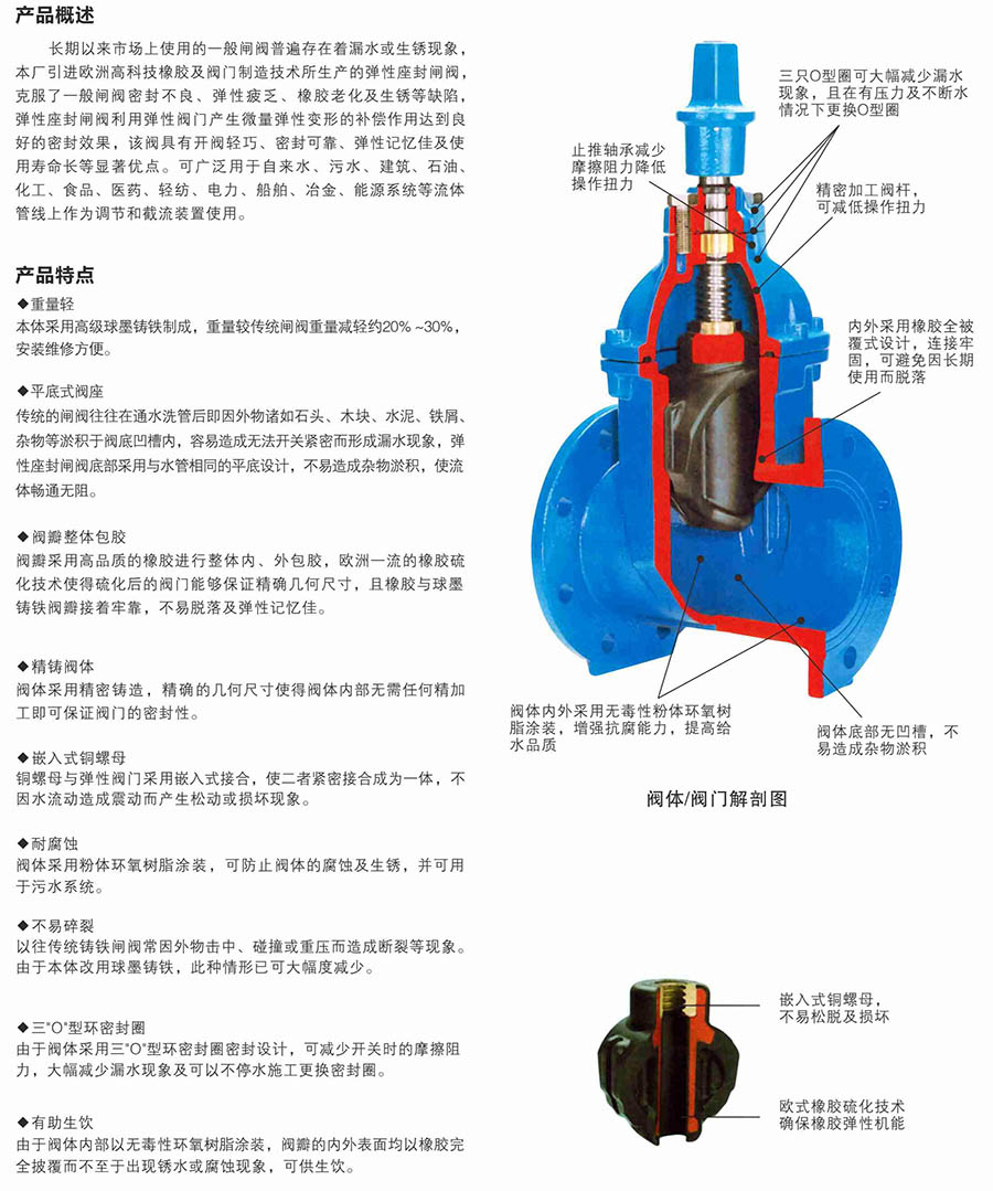 RHVX/Z45X彈性軟密封閘閥,長期以來市場上使用的一般閘閥普遍存在著漏水或生銹現(xiàn)象,上海川滬閥門引進(jìn)歐洲高科技橡膠及閥門制造技術(shù)所生產(chǎn)的彈性座封閘閥,克服了一般閘閥密封不良、彈性疲乏、橡膠老化及生銹等缺陷,彈性座封閘閥利用彈性閥門產(chǎn)生微量彈性變形的補(bǔ)償作用達(dá)到良好的密封效果,該閥具有開閥輕巧、密封可靠、彈性記憶佳及使用壽命長等顯著優(yōu)點??蓮V泛用于自來水、污水、建筑、石油、化工、食品、醫(yī)藥、輕紡、電力、船舶、冶金、能源系統(tǒng)等流體管線上作為調(diào)節(jié)和截流裝置使用。