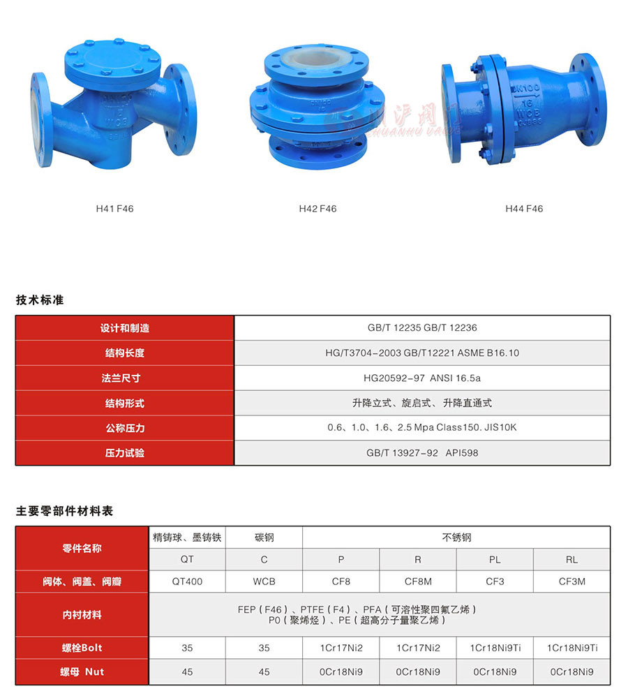 H41F46/H42F46/H44F46襯氟止回閥又稱氟塑料襯里耐腐閥門專用于控制腐蝕性或強腐蝕性介質(zhì),閥體內(nèi)腔表面覆有可供選擇的各種氟塑料,具有強度高、耐腐蝕性能好的特點;適用于不同工作溫度和流體管路,防止各類管路或設(shè)備上的介質(zhì)逆流的單向啟閉。